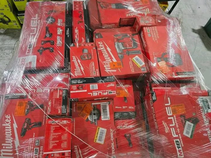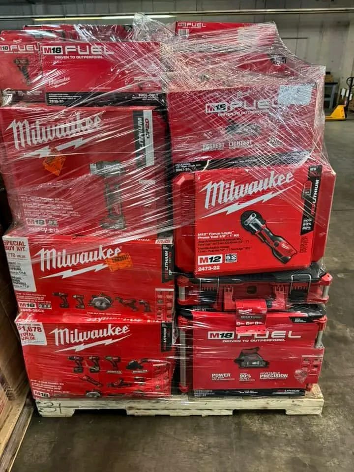 MINI Bulk pallet of professional-grade Milwaukee and DeWalt power tools, including M18 FUEL, M12, XR, and Atomic series. Ideal for contractors, resellers, and serious DIYers. Clearance pricing available.